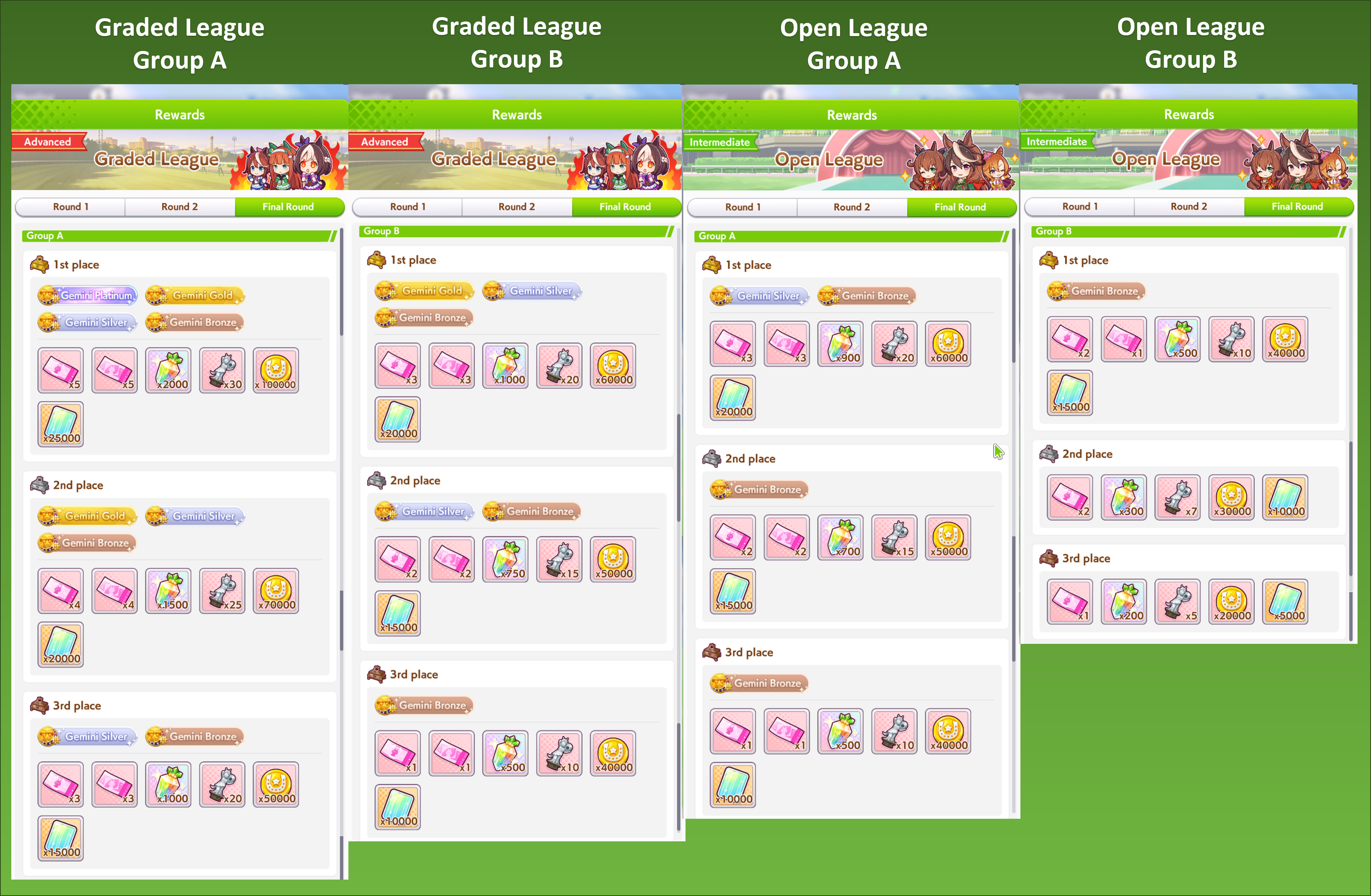 En Open League, vous devrez inscrire exclusivement des uma de rang -strictement- inférieur à B+ ; c'est à dire, B ou moins. Vous rencontrerez donc uniquement des adversaires de ranks B ou moins. En Graded League il n'y a pas de limite, et il est tout à fait possible de tomber occasionellement sur des uma de rank S ou plus (extrêmement rare). Graded League apporte plus de récompenses que Open League.